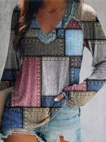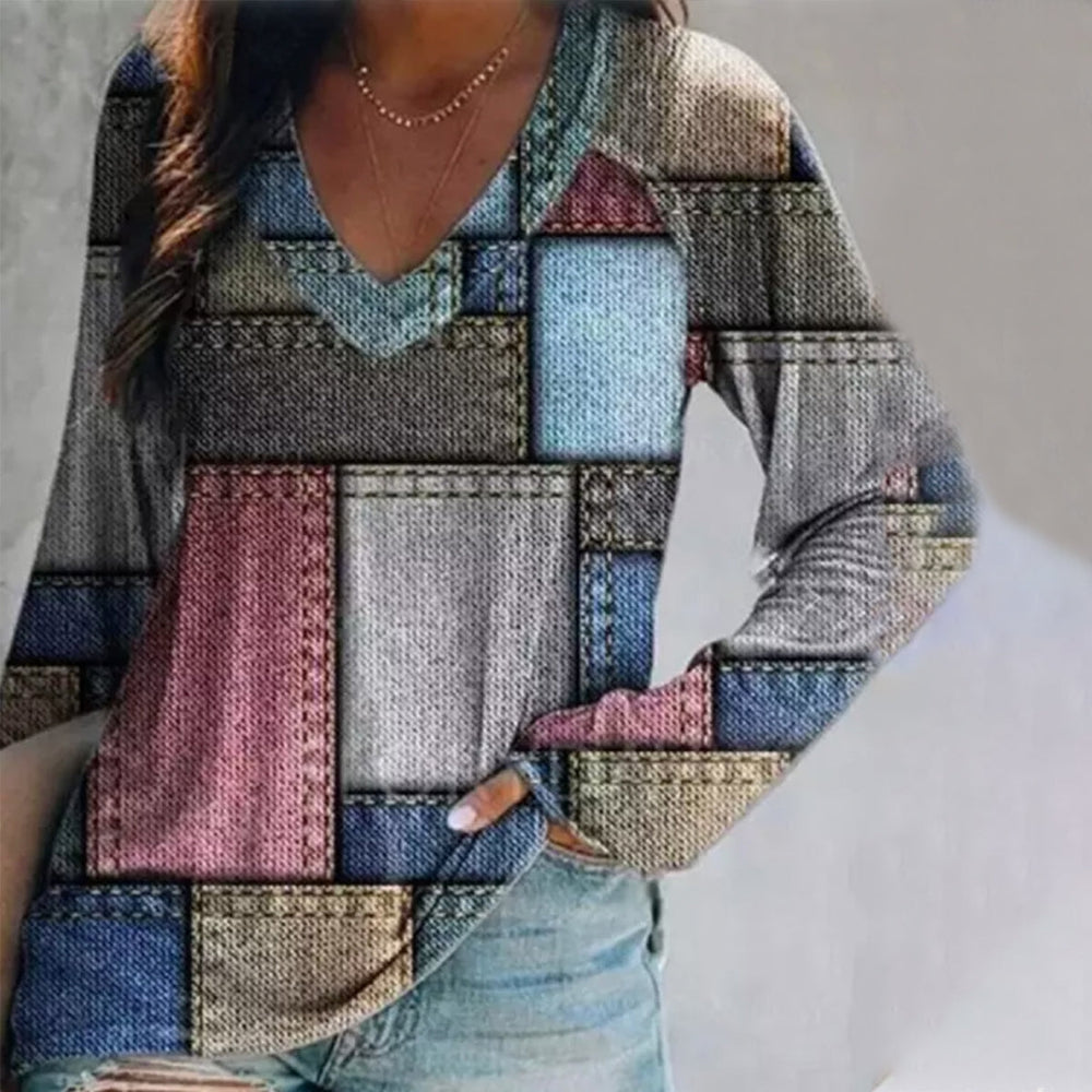 Add retro vibes with this patchwork print layering top, giving it the illusion of colorful denim stitched panels. Rustic reddish-pink, muted blue, lightest olive, and shades of gray make this relaxed long sleeve top the ultimate go-to for a laid-back style. Finish your look with a denim or black jacket, or wear it solo with jeans. Machine wash normal with light colors or hand wash. May be hung up to dry or lay flat. Light ironing if needed.