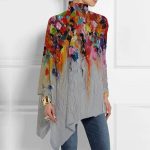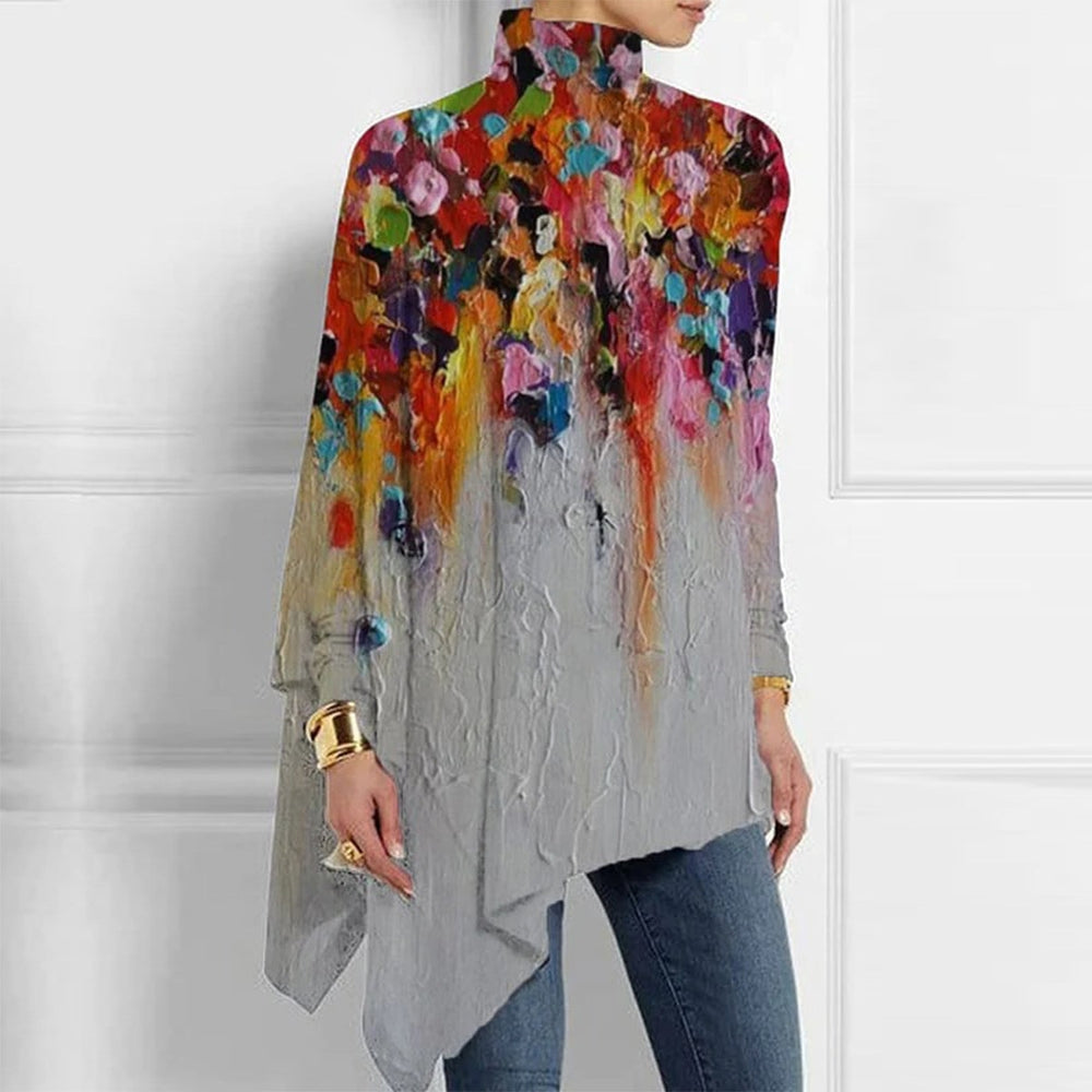 Unique style is in bloom with this asymmetrical top featuring pops of color resembling an abstract flower garden, just in time for the upcoming season. The high neck, long sleeves, and below-the-waist hem give this artistic top the perfect coverage from day to night. Finish your look with leggings or jeans.