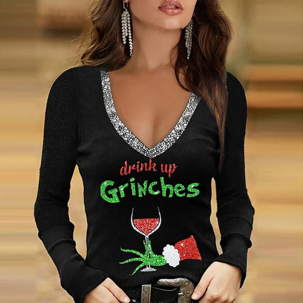 Get tipsy in chic style wearing this tongue-in-cheek black v-neck top, just in time for the holidays! This super-cute top features a red wine glass and a single rose with the green words DRINK UP GRINCHES! Turn any frown upside down with this conversational-starting long sleeve top.