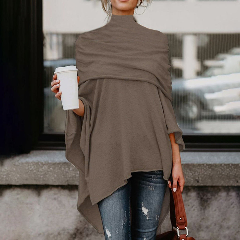 Get wrapped up and cozy this winter and fall season with this modern wrapped scarf top, making it easy to take your day look into the night. A high neckline with draped long sleeves and openings gives it versatility with layering under a jacket or on top of a camisole.