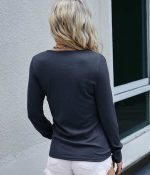 This versatile navy blue top is all you need to complete your look, featuring shiny silver-tone snap buttons down the plunging round collar v-neckline and a single front pocket. The body-skimming material and long sleeves provide balance of a bodycon yet a comfortable, laid-back fit. Finish your look with jeans, leggings, or slacks. Wash in gentle or delicate cycle with light colors. Keep away from dark colors.