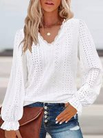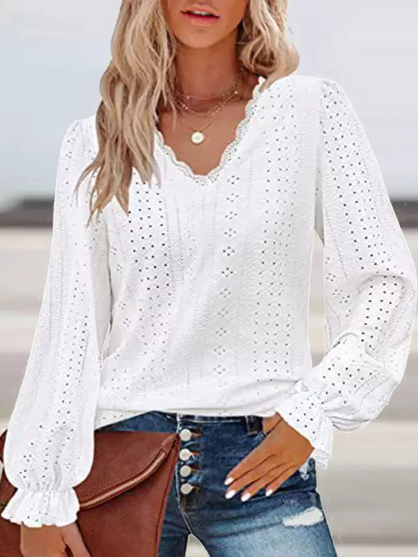 Everyday is summertime with this beautiful all-white eyelet lace top featuring a plunging v-neck with lace trim, ideal for pairing with your favorite necklaces. The long balloon sleeves and slightly oversized fit make this laid-back blouse perfect for layering with a camisole, jacket, and much more.