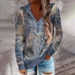 This long-sleeve top features a Henley style with a laid-back oversized hood and long blue drawstrings. The plunging v-neck button front top, long sleeves, and watercolor ombre shading make the white swirling paisley print pop. Add your favorite cami and lightweight necklaces for a layered look. Machine wash normal with light colors or hand wash. May be hung up to dry or lay flat. Light ironing if needed.