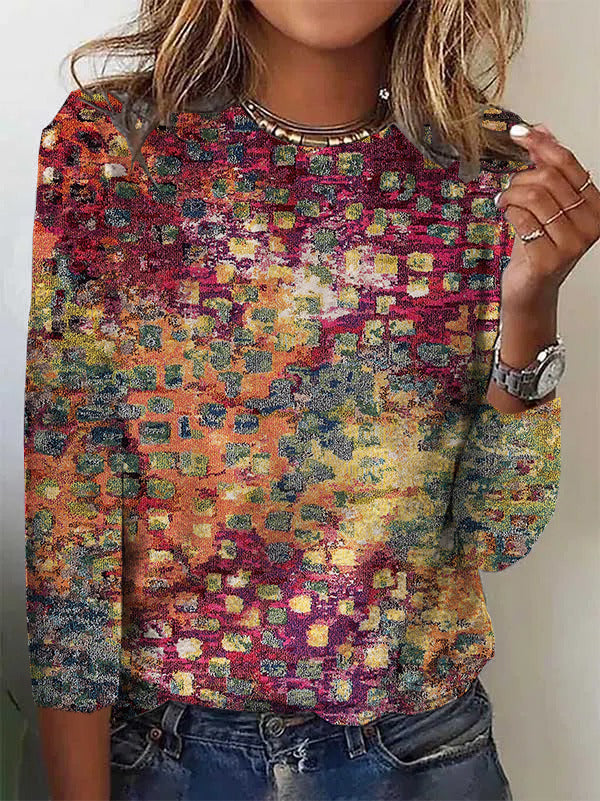 Vibrant pops of color collide on this chic square polka dot top, giving it an eye-catching look. Add color and artistry to your day, night, or workwear with this sophisticated long sleeve round collar top, comfortably sitting waist-length. Layer this shirt with a cami underneath, or wear it solo as the main focal point.