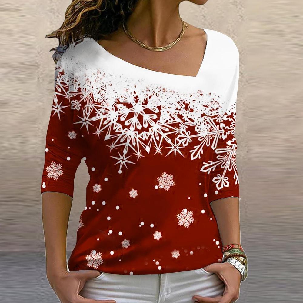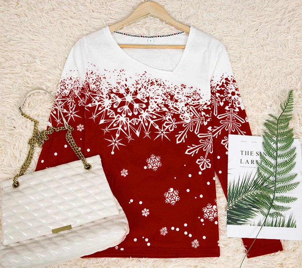 This bright white and red long-sleeved holiday top demands attention with its elegant style. A boxy asymmetrical collar and color block cherry red and white falling snowflake design makes a statement in modern sophistication. Wear this picture-perfect Christmas top to work, a casual day out, or a night under the stars. Machine wash normal with light colors or hand wash. Bleach if needed. May be hung up to dry or lay flat. Tumble dry with low heat. Light ironing if needed.